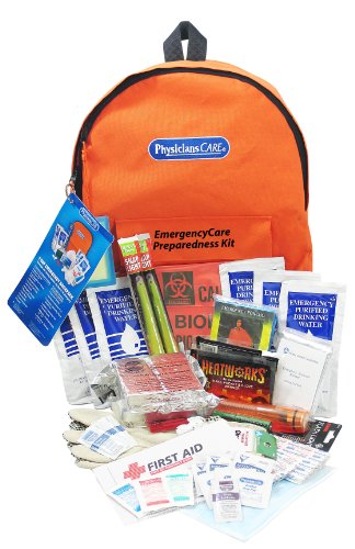 Whether at work or at play, in the car or truck or in the great outdoors, be prepared with a quality PhysiciansCare First Aid Kit that provides the first aid needed for ANY occasion. Contains critical components needed when an emergency occurs including bad weather and power outages. Includes first aid kit and Emergency Products. Orange, lightweight backpack with padded shoulder straps. Glow-in-the-dark tag makes it easy to carry, easy to find. Perfectly sized to store additional items. Contents include: Food, Water, Whistle, Light Stick, Flashlight, Rain Poncho, Emergency Blanket, Hand Warmers, Mask, Gloves, Hand Sanitizer, First Aid Kit.